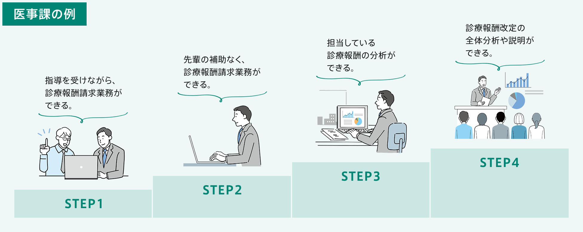 様々な視点や考えを持った方たちに活躍していただくため、学部・学科や現在の医療知識の有無を問わず採用を行っています。そのため、1~4年目の事務総合職を対象にした「ラダー型教育プログラム」という教育制度があります。「ラダー型教育プログラム」は、キャリアの基礎を築くための育成プログラムで、段階ごとに基準を決めて、Ladder(=はしご)を登るようにレベルアップするしくみとなっています。比較的年齢の近い先輩から、1対1できめ細かい指導やアドバイスを受けながら業務を行うので、疑問点や迷いを早期に解消し、確実に成長することができます。